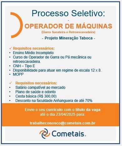 Cometais seleciona Operador de máquinas; Envie seu currículo!