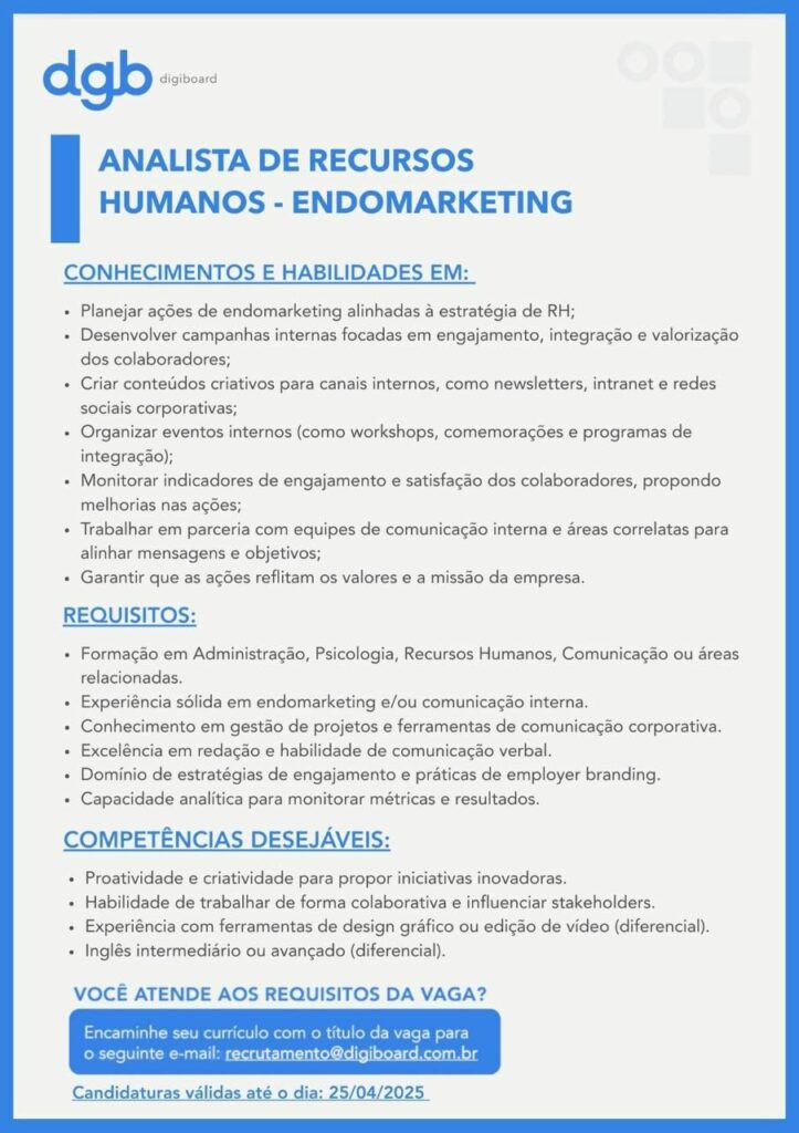 O processo seletivo para esta(s) vaga(s) não cobra absolutamente nada pela sua candidatura. Portanto, jamais aceite qualquer tipo de cobrança para cadastrar seu currículo.