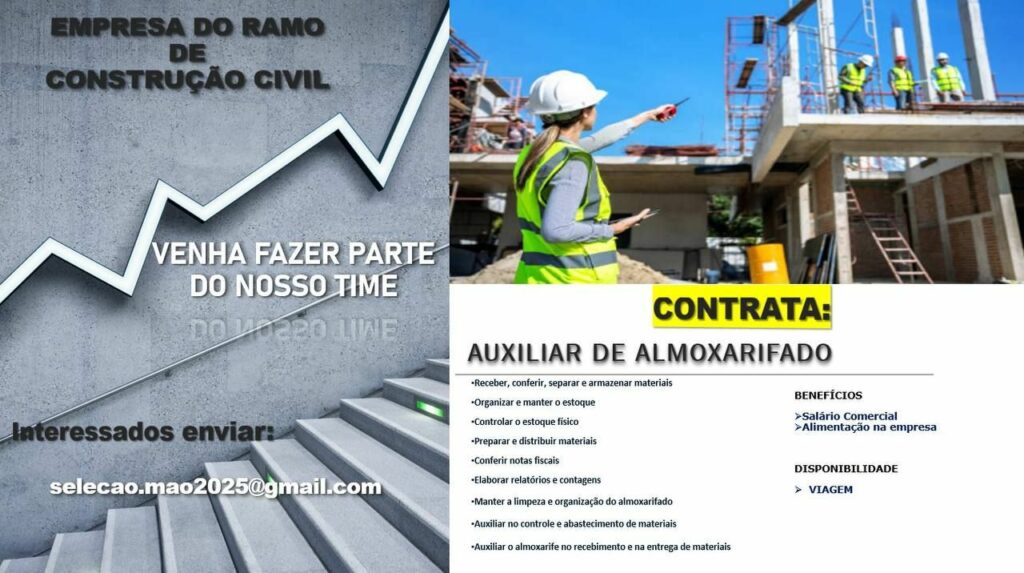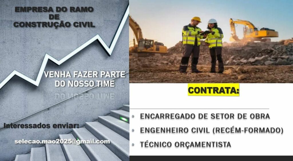 Empresa do ramo de construção civil contrata Auxiliar de almoxarifado, Encarregado de setor de obra, Engenheiro civil, Técnico Orçamentista; Envie seu currículo!