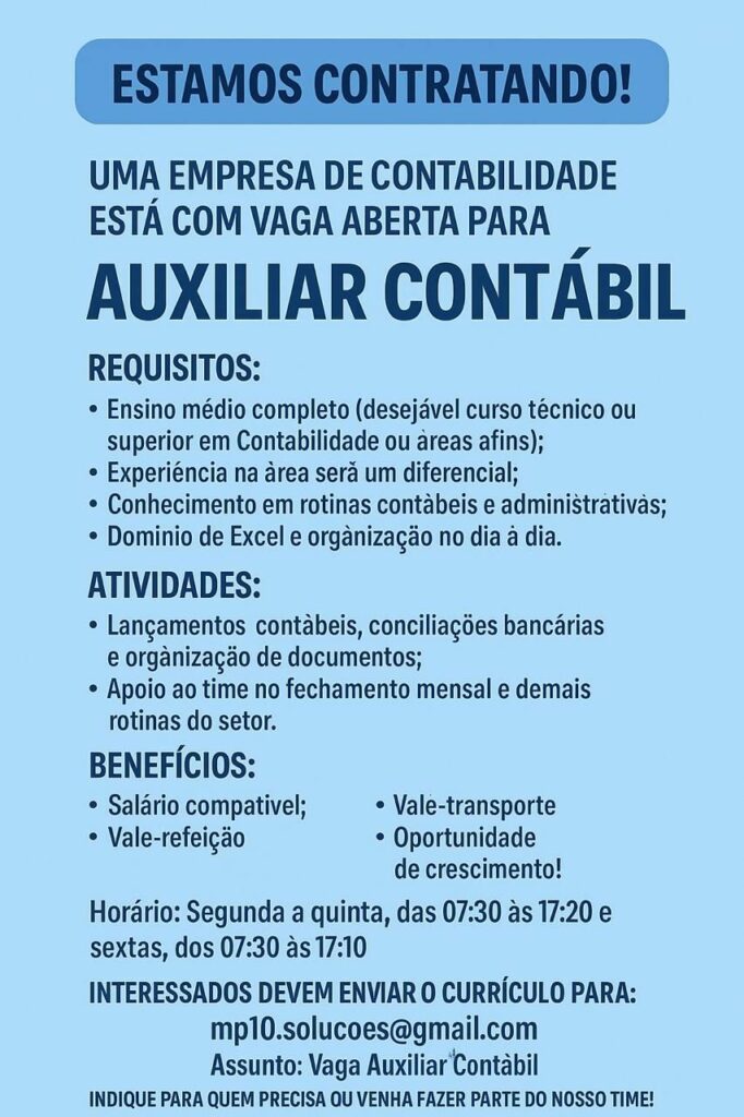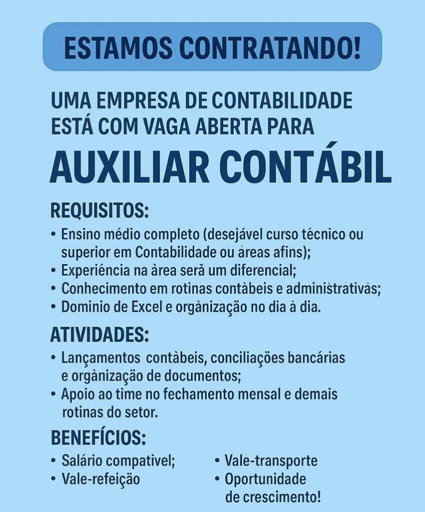 Empresa está selecionando Auxiliar contábil; Envie seu currículo!