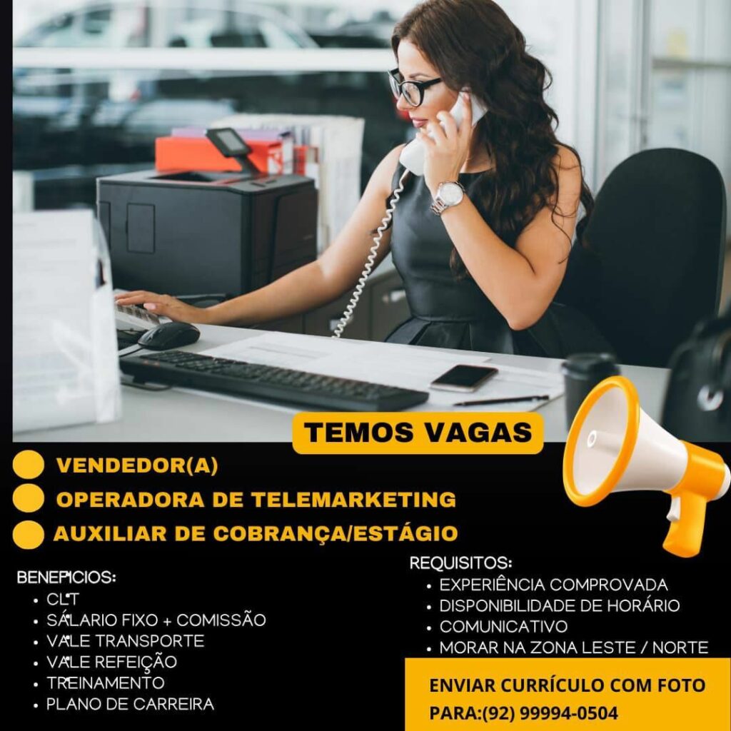 Empresa está selecionando Vendedor (a), Operadora de telemarkenting, Auxiliar de cobrança estágio; Envie seu currículo!
