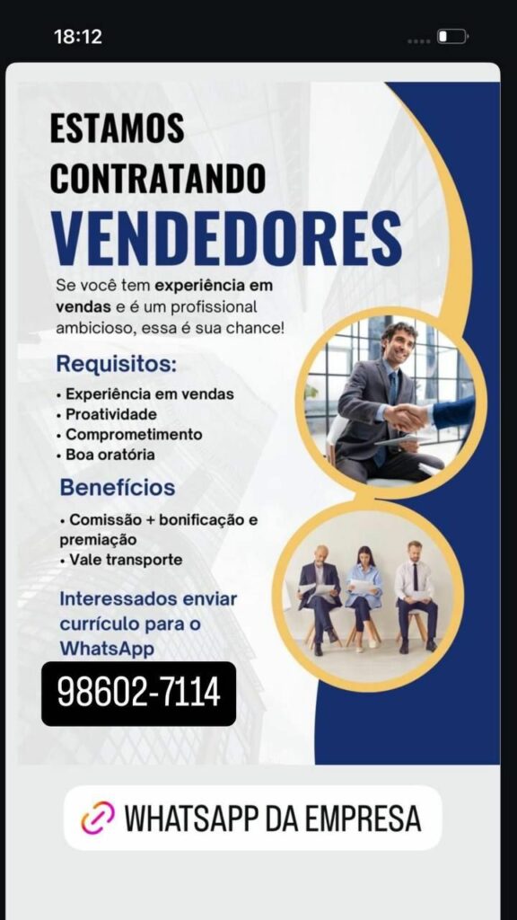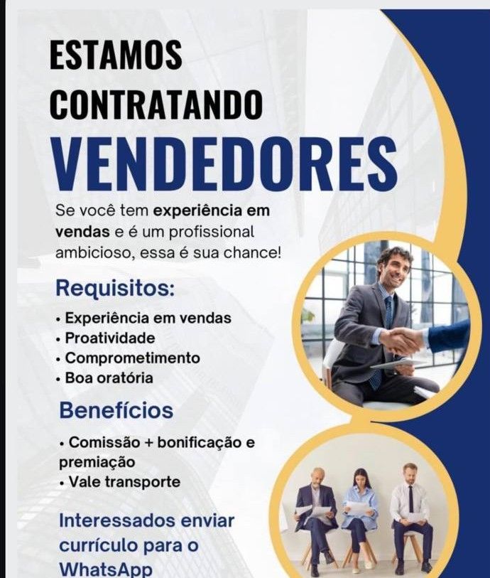 Empresa está selecionando Vendedores; Envie seu currículo!