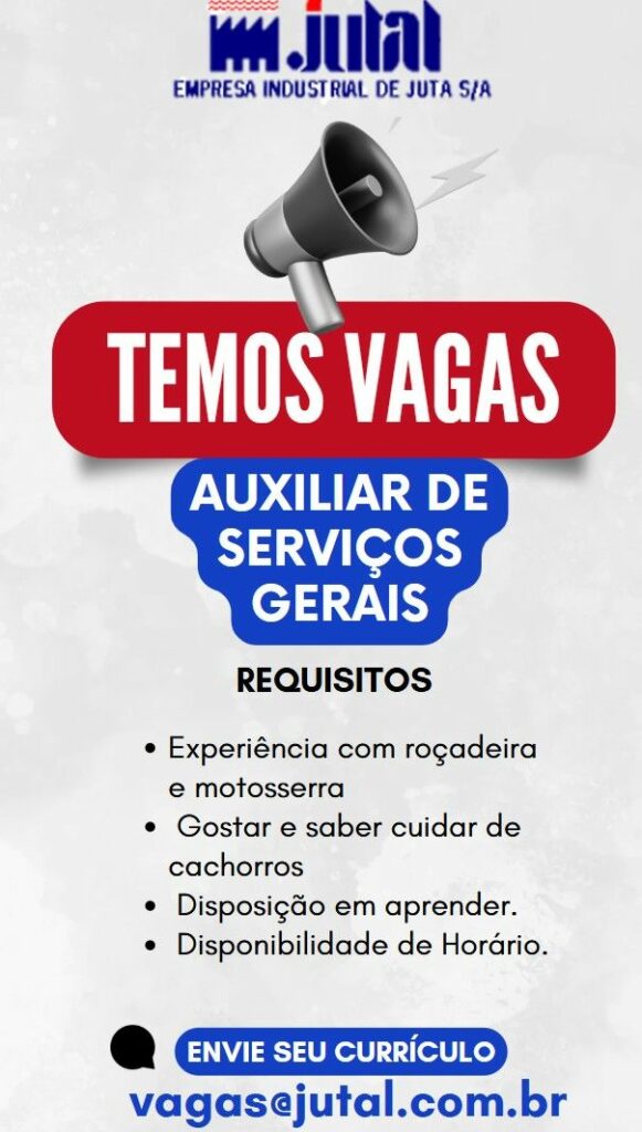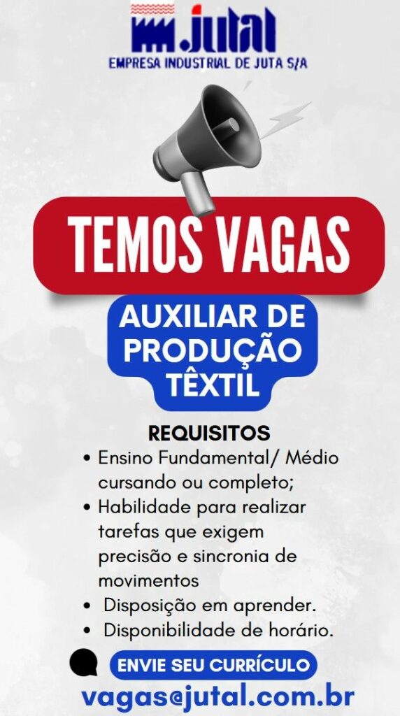 Empresa industrial Jutal seleciona Auxiliar de de produção têxtil, Auxiliar de serviços gerais; Envie seu currículo!