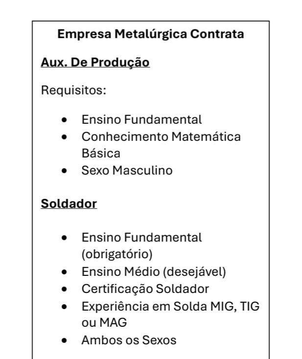 Empresa metalúrgica contrata Auxiliar de produção; Envie seu currículo!