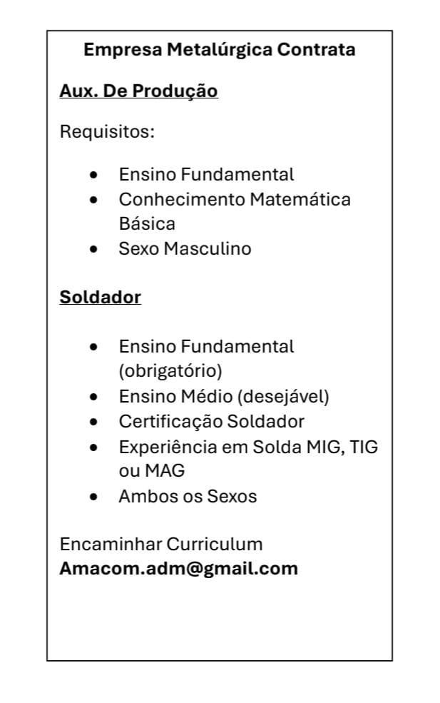 O processo seletivo para esta(s) vaga(s) não cobra absolutamente nada pela sua candidatura. Portanto, jamais aceite qualquer tipo de cobrança para cadastrar seu currículo.
