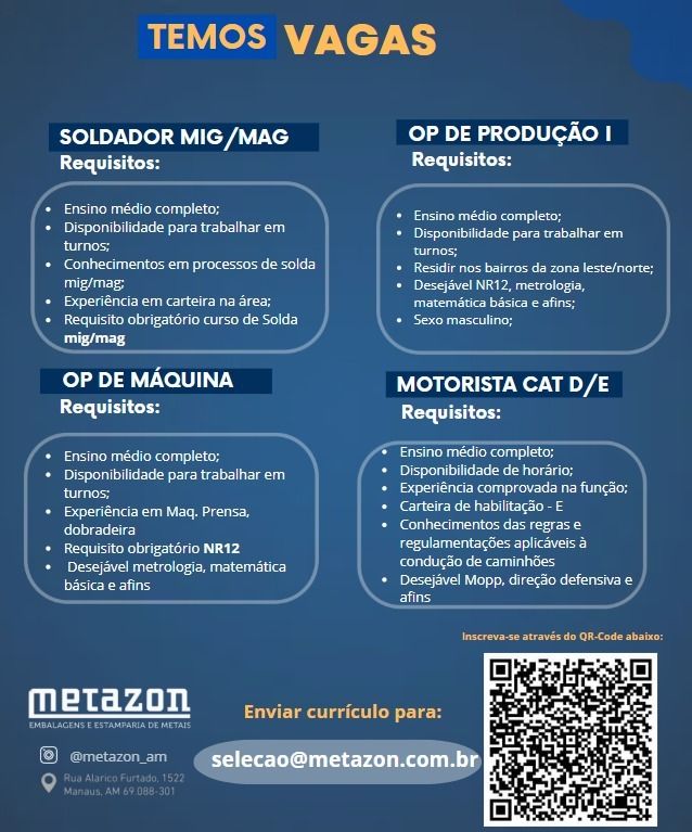 Empresa Metazon seleciona Operador de produção l, Operador de máquina, Motorista Cat D E, Soldador mig mag; Envie seu currículo!