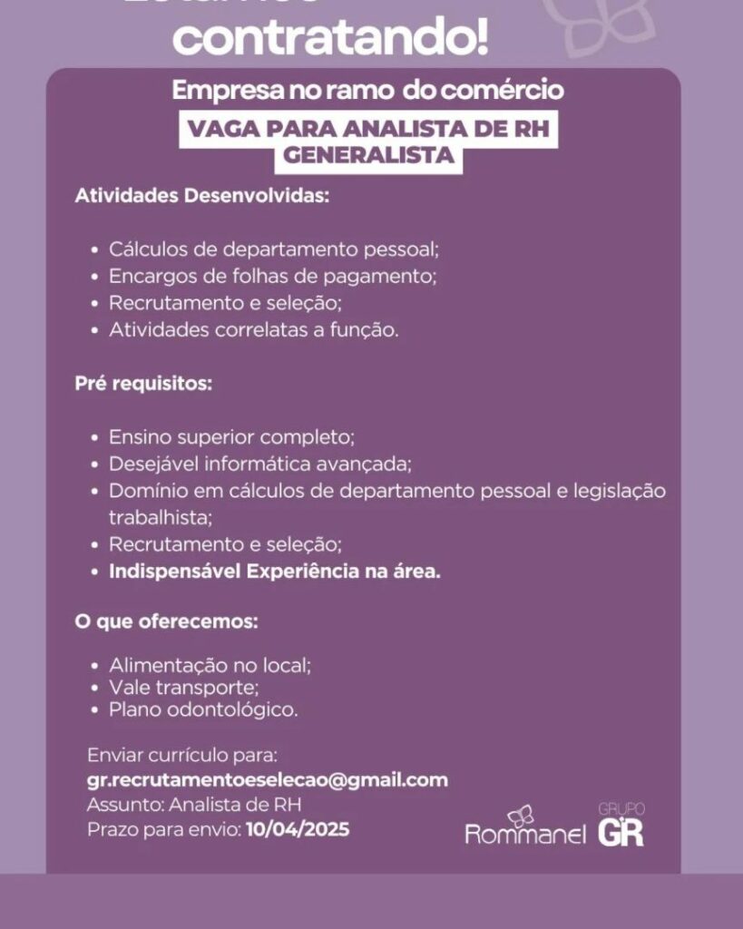 Rh seleciona Promotor de vendas, Assistente financeiro, Assistente comercial, Estoquista, Operador de empilhadeira, Ajudante de carga e descarga; Envie seu currículo!