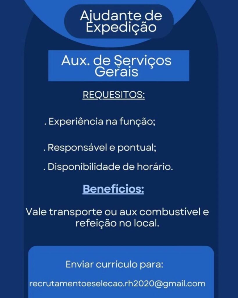 Empresa seleciona Ajudante de expedição, Auxiliar de serviços gerais; Envie seu currículo!