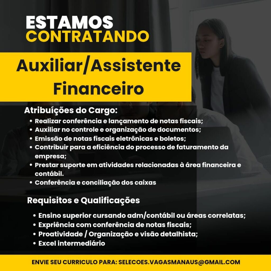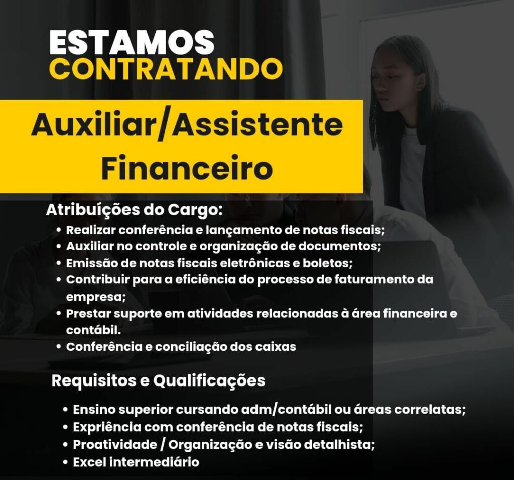 Empresa seleciona Auxiliar Assistente financeiro; Envie seu currículo!