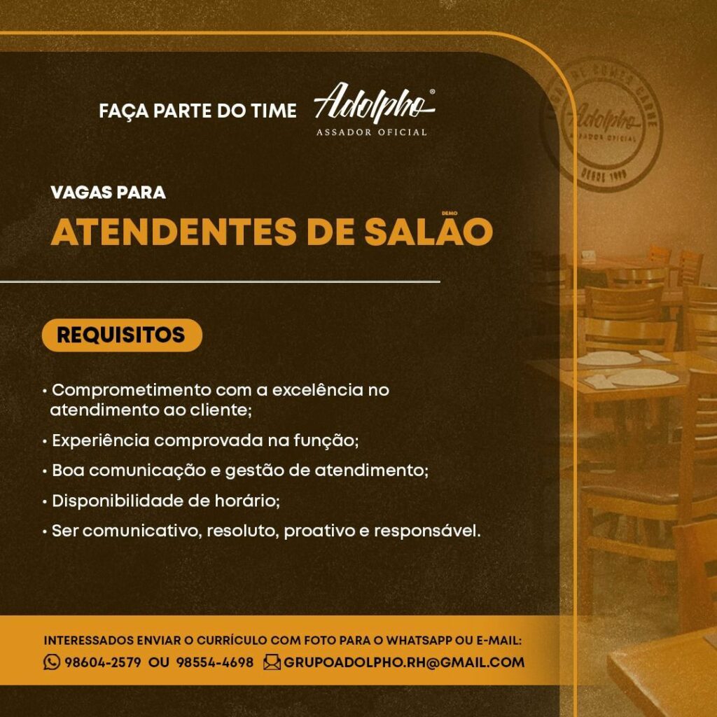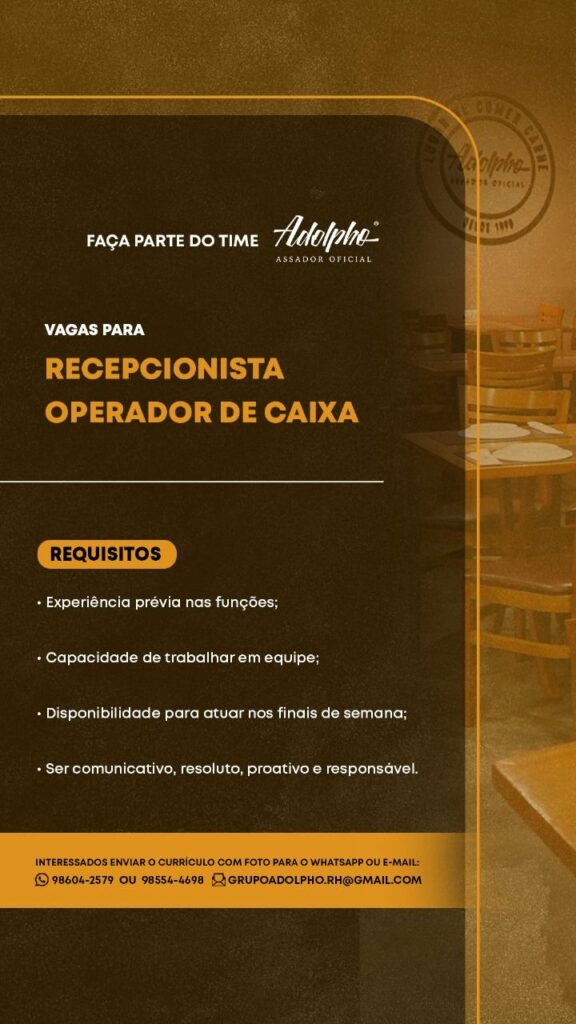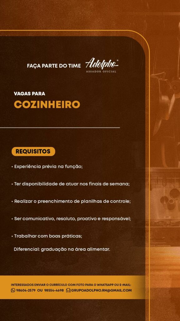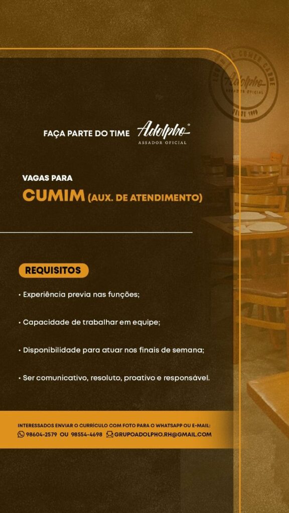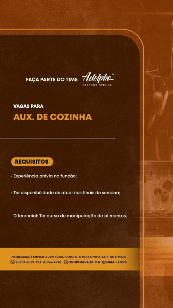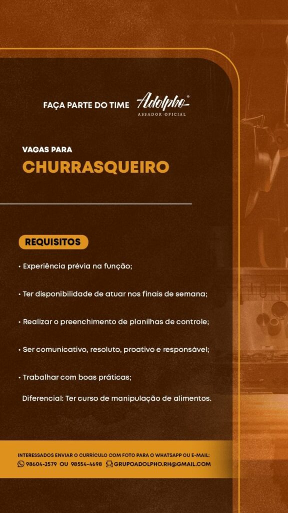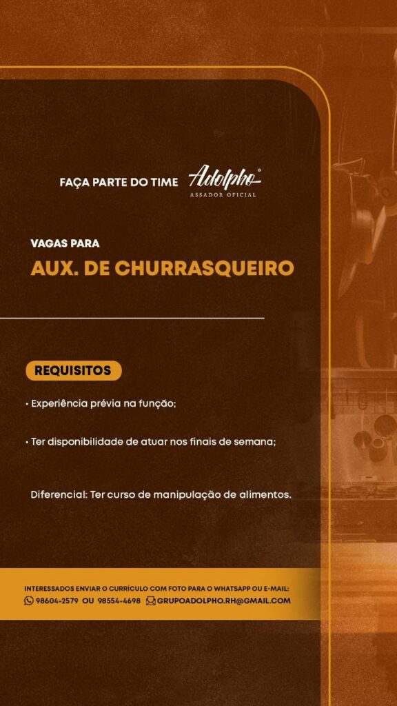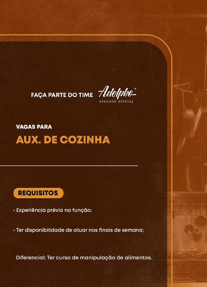 Empresa seleciona Cozinheiro, Auxiliar de cozinha, Churrasqueiro, Auxiliar de churrasqueiro, Recepcionista, Operador de caixa, Cumim, Atendente de salão, Supervisor (a) de unidade; Envie seu currículo!