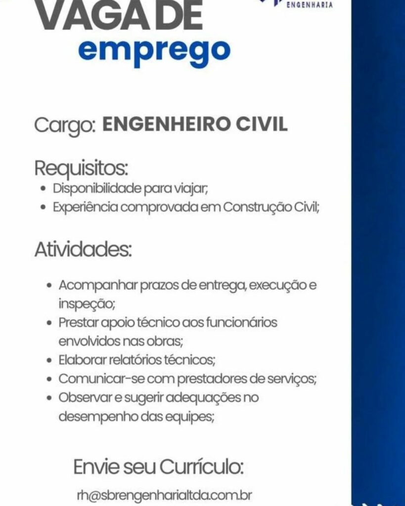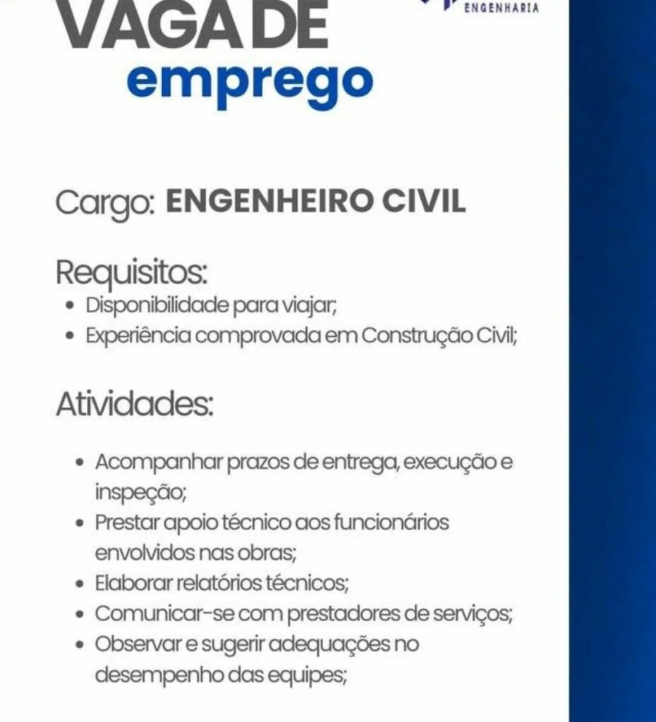 Empresa seleciona Engenheiro civil; Envie seu currículo!