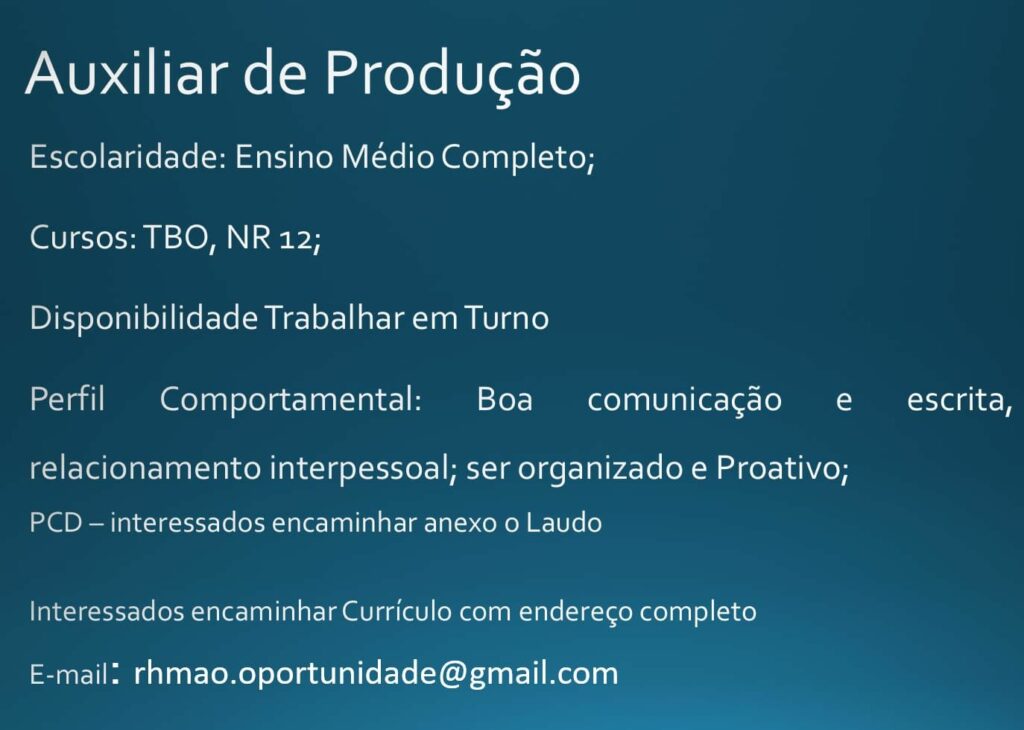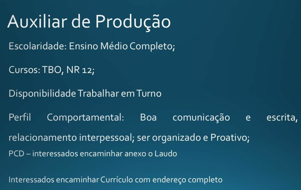 Empresa seleciona para vaga de Auxiliar de produção; Envie seu currículo!