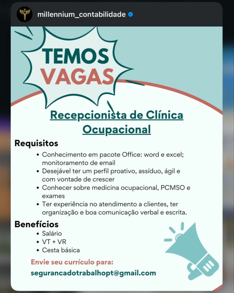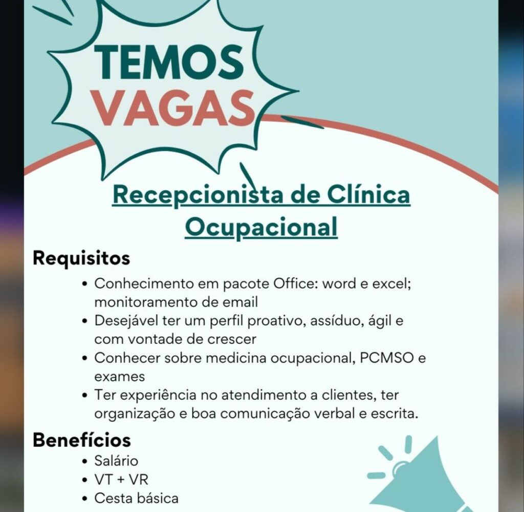 Empresa seleciona Recepcionista de clínica Ocupacional; Envie seu currículo!