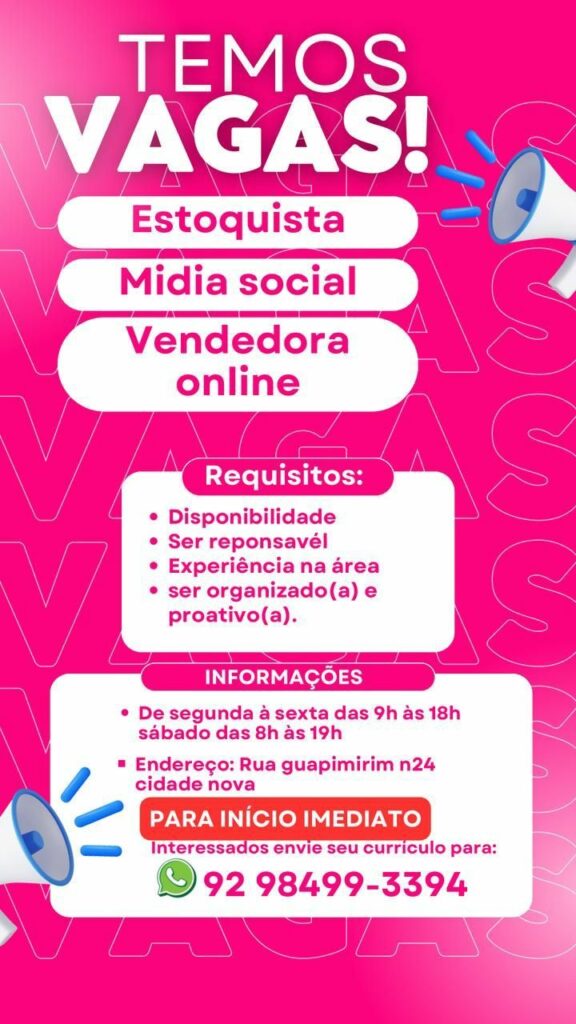 Empresa seleciona Vendedora on line, mídia social, Estoquista; Envie seu currículo!