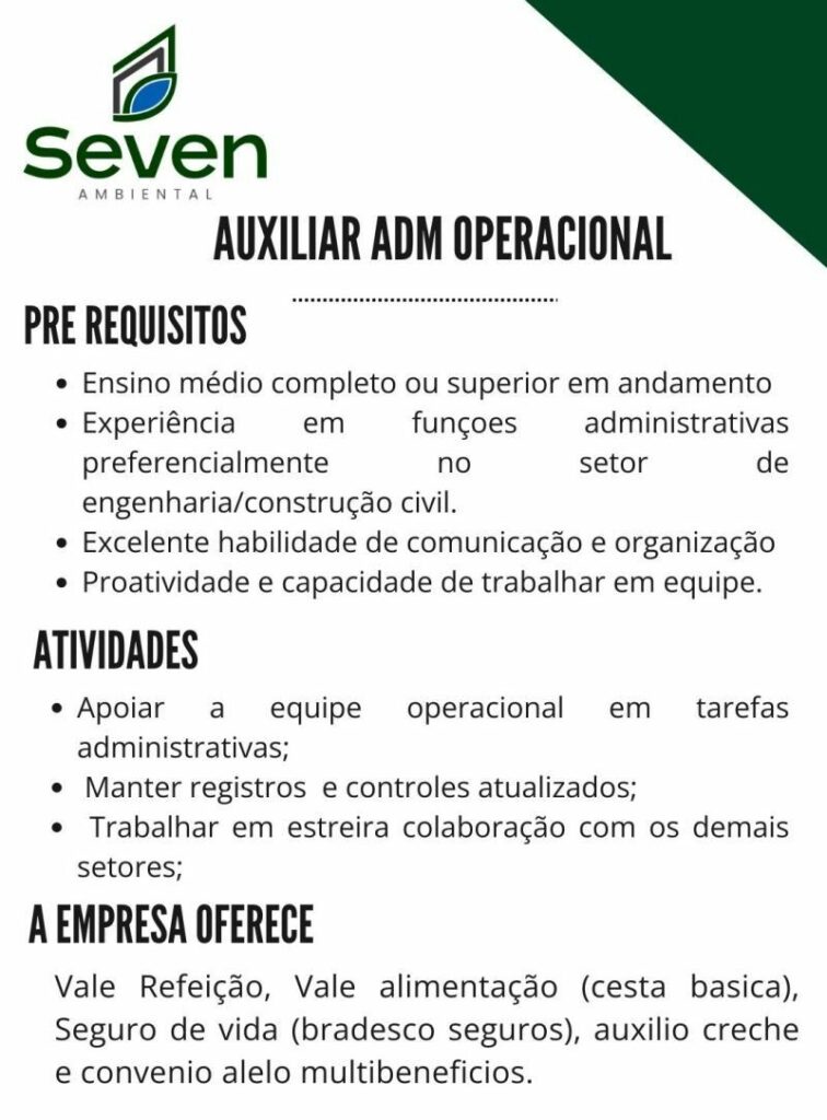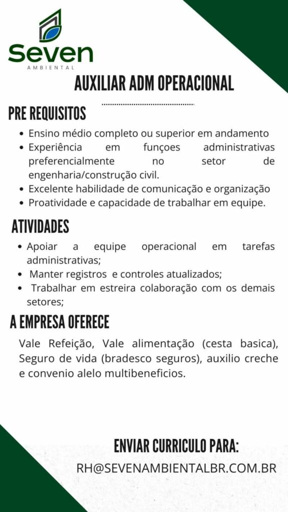 Empresa Seven seleciona Auxiliar adm operacional; Envie seu currículo!