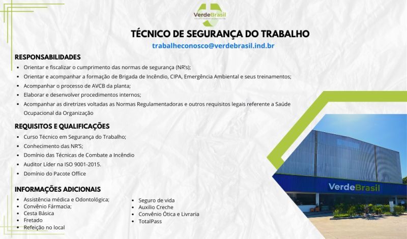Empresa Verde Brasil seleciona Técnico de segurança do trabalho; Envie seu currículo!