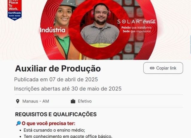 A Solar Coca-Cola, uma das maiores fabricantes do Sistema Coca-Cola no Brasil, está com uma oportunidade de emprego para o cargo de Auxiliar de Produção em Manaus, Amazonas. Esta posição é ideal para profissionais que buscam ingressar ou se desenvolver na área industrial, contribuindo diretamente para os processos produtivos de uma empresa renomada no mercado de bebidas.