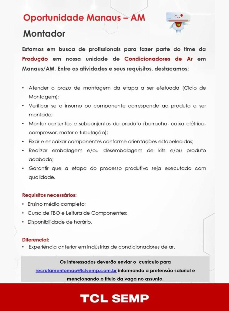 Fábrica da TCL Semp está selecionando Montador (produção); Envie seu currículo!