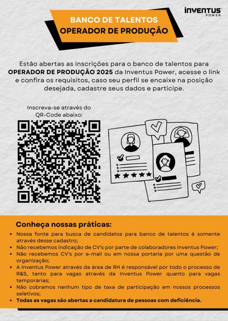 Fábrica Inventus Power seleciona Operador de produção; Envie seu currículo!
