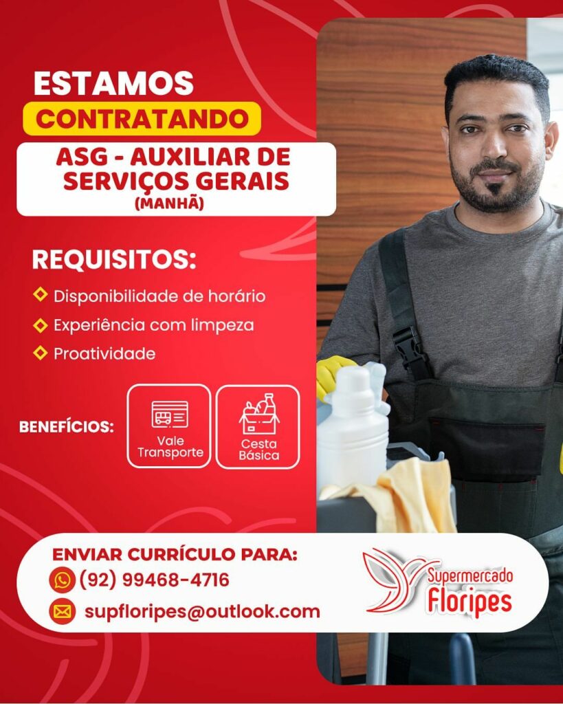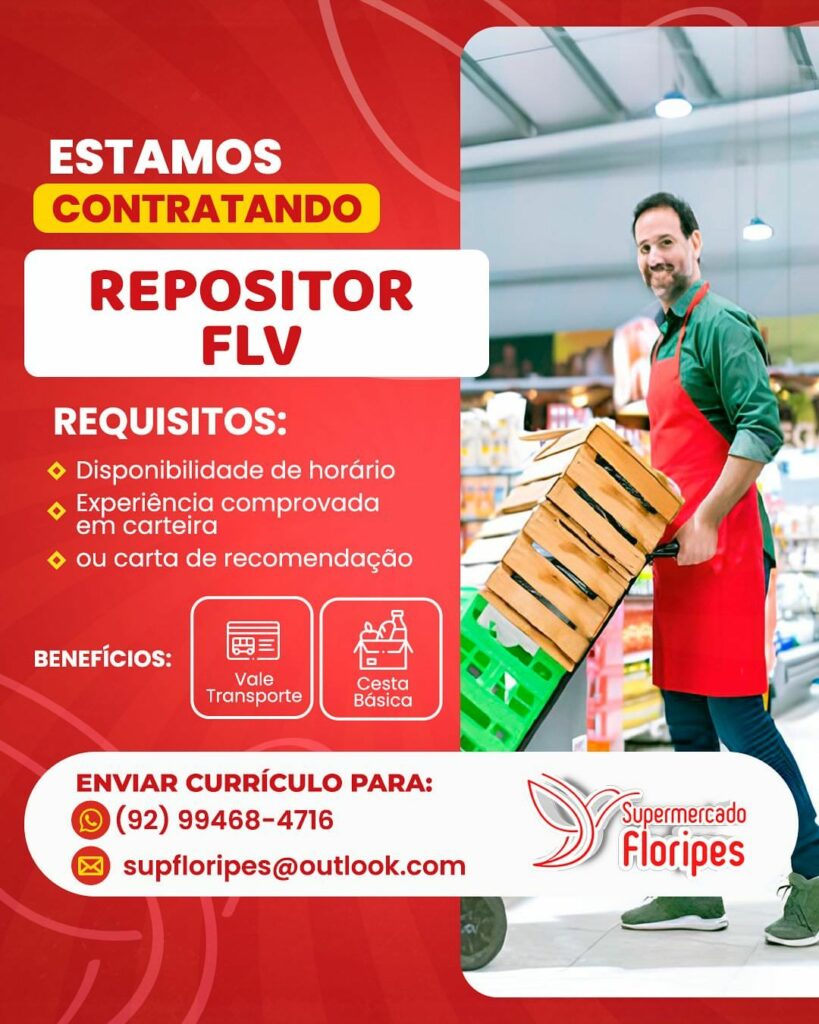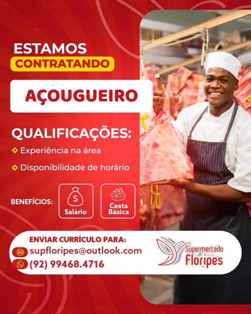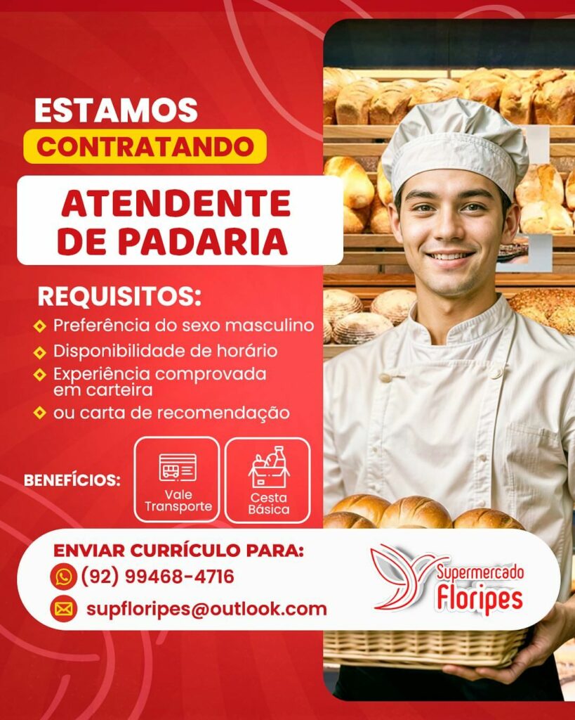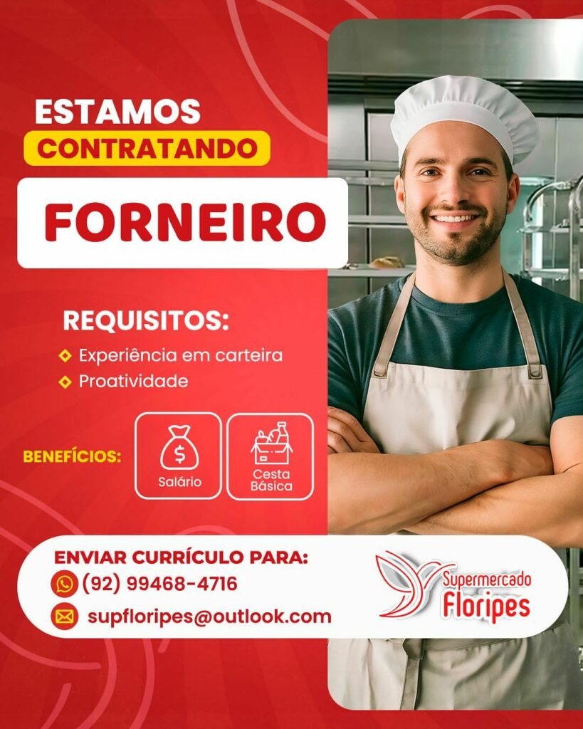 Floripes supermercado seleciona Auxiliar de serviços gerais, Açougueiro, Atendente de padaria, Repositor flv, Forneiro; Envie seu currículo!