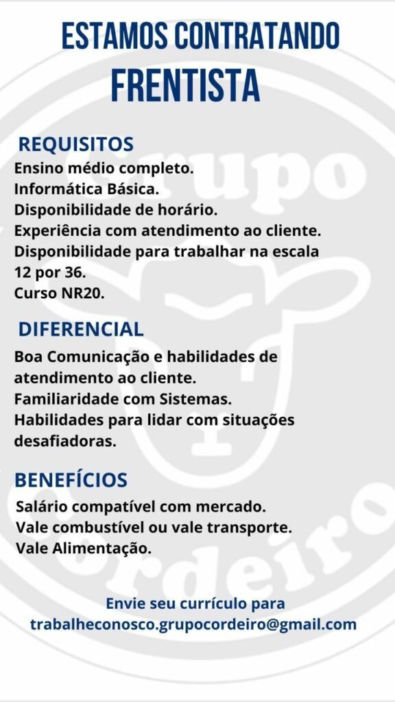 Grupo Cordeiro seleciona Frentista; Envie seu currículo!