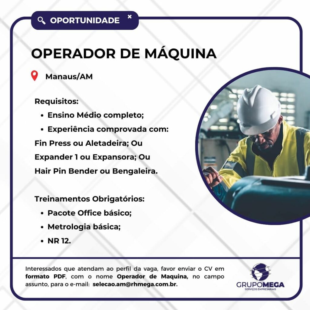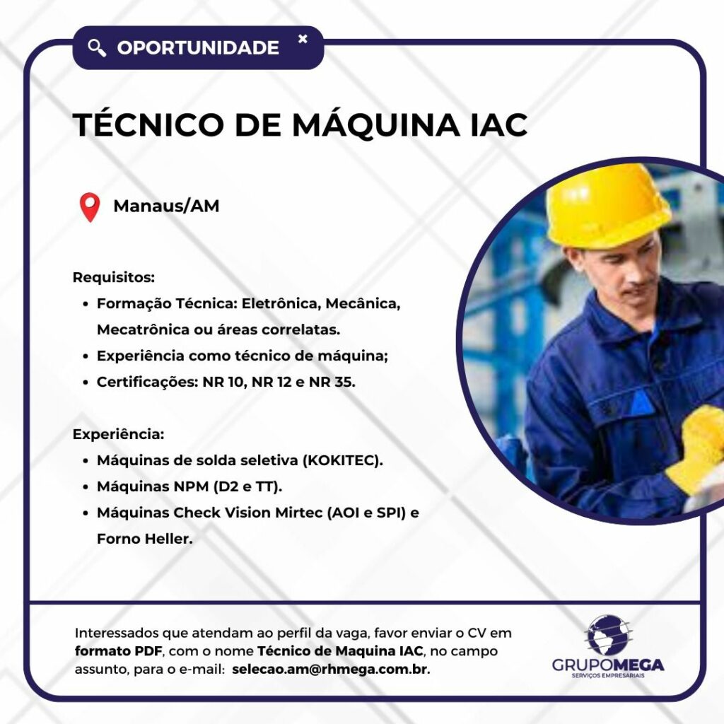Grupo Mega seleciona Operador de máquina, Técnico de máquina IAC; Envie seu currículo!