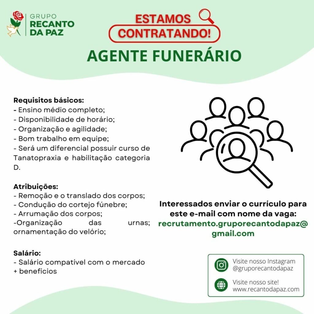 Grupo Recanto da paz seleciona Agente funerário; Envie seu currículo!