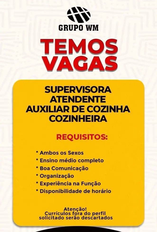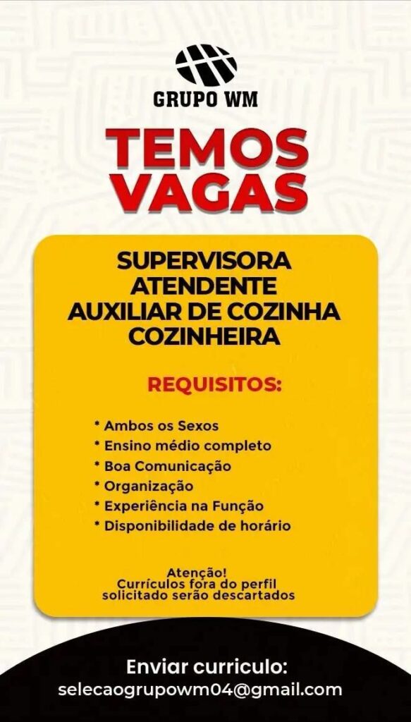 Grupo WM seleciona Supervisora, Atendente, Auxiliar de cozinha, Cozinheira; Envie seu currículo!
