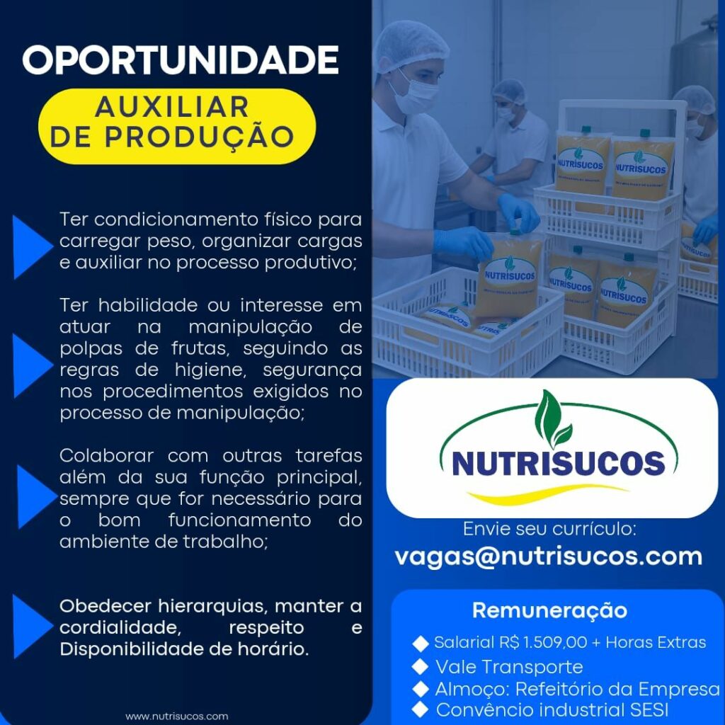 Nutrisucos seleciona Auxiliar de produção; Envie seu currículo!