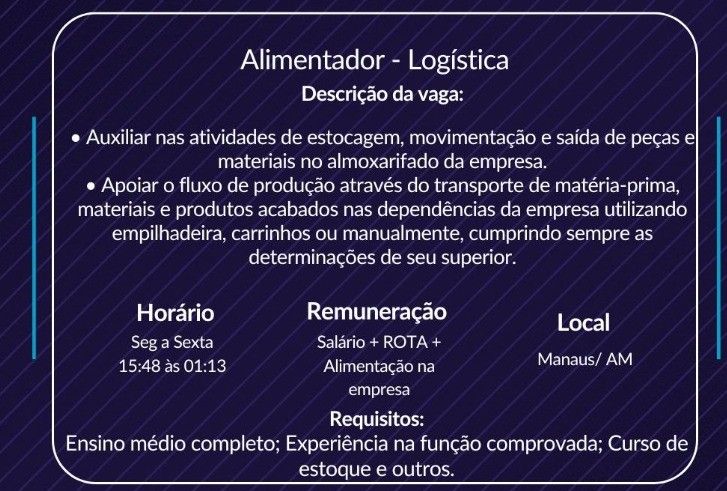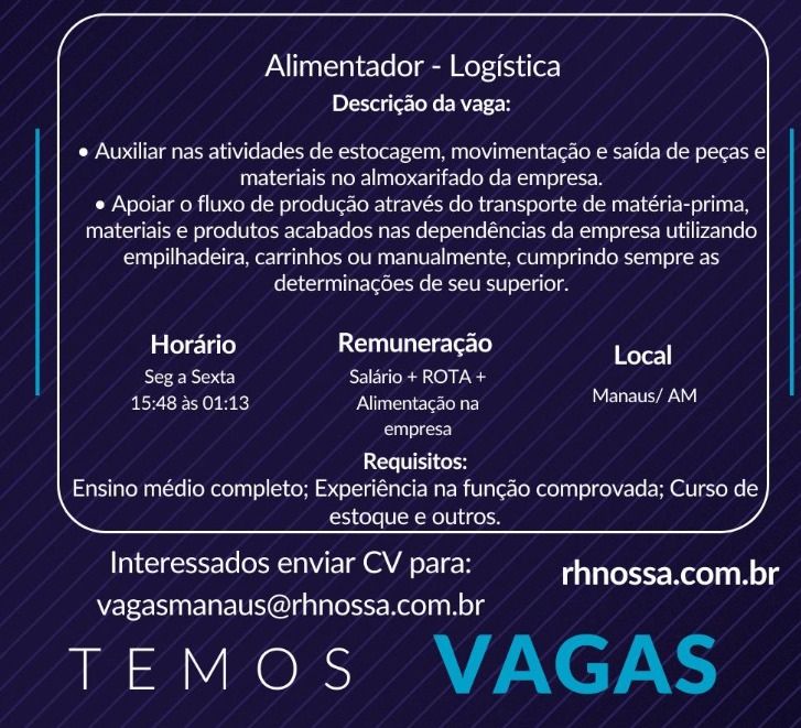 Rh está selecionando Alimentador logístico; Envie seu currículo!