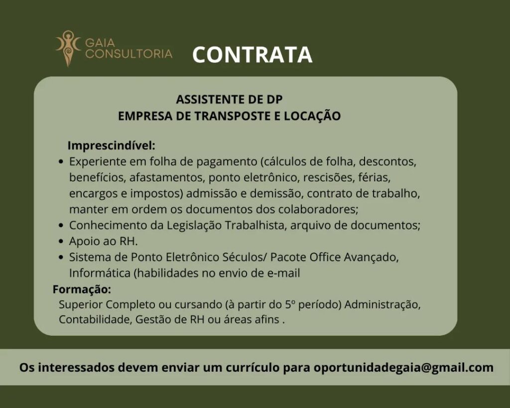 Rh está selecionando Assistente de DP; Envie seu currículo!