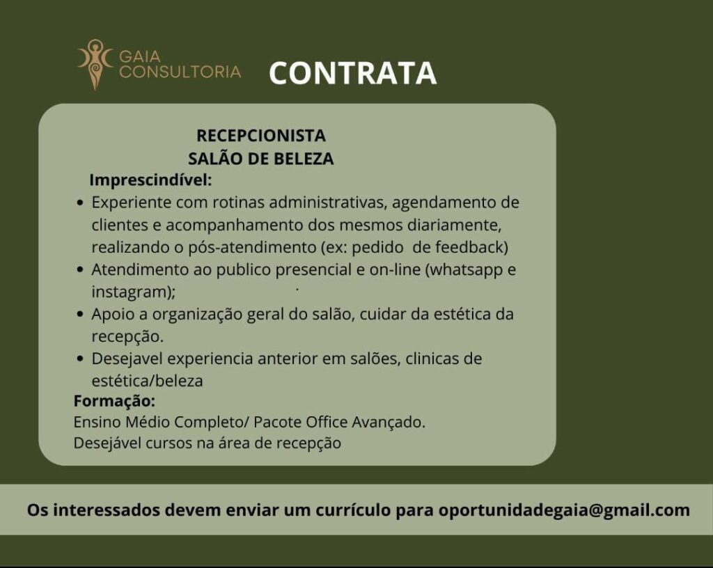 Rh está selecionando Recepcionista; Envie seu currículo!