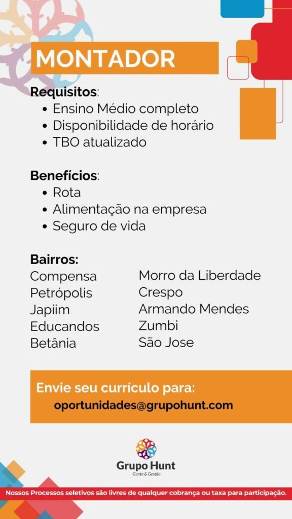 Rh seleciona para vaga de Montador; Envie seu currículo!
