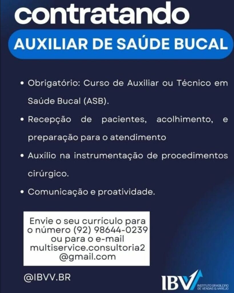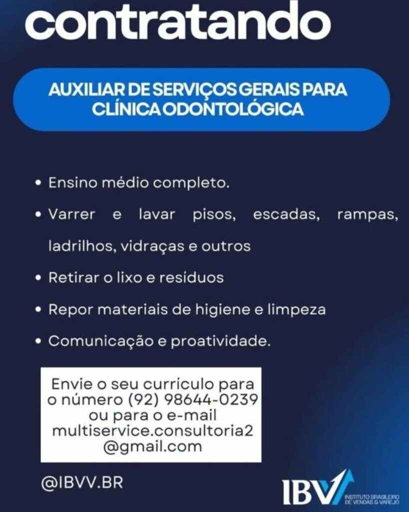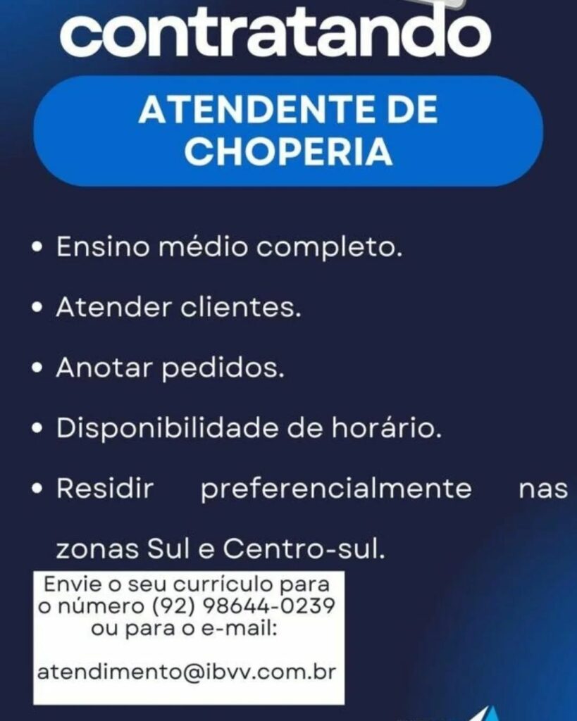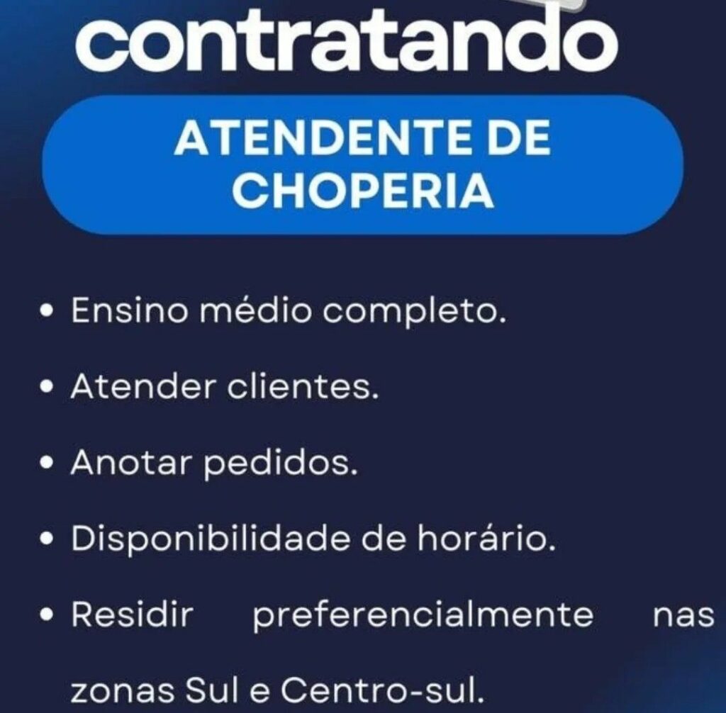 Seleção para seguintes vagas Atendente de choperia, Supervisor (a) de restaurante, Auxiliar de saúde bucal, Assistente Administrativo, Auxiliar de serviços gerais; Envie seu currículo!