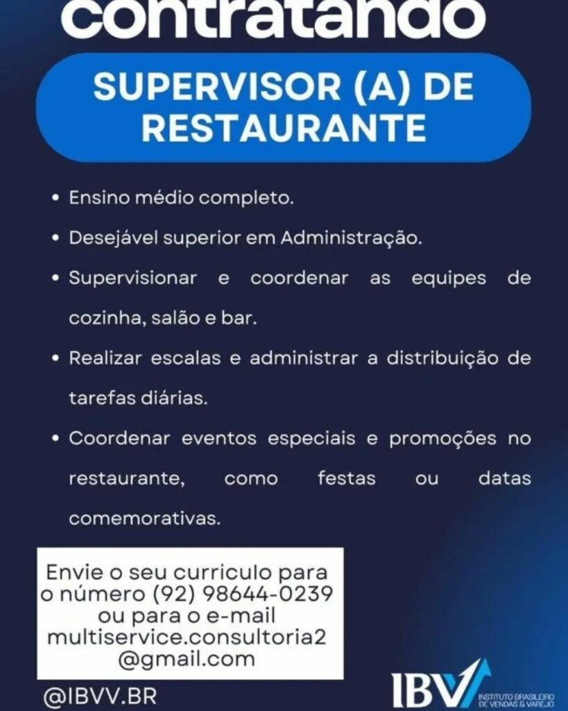 Empresa deseja contratar Supervisor de salão; Envie seu currículo!