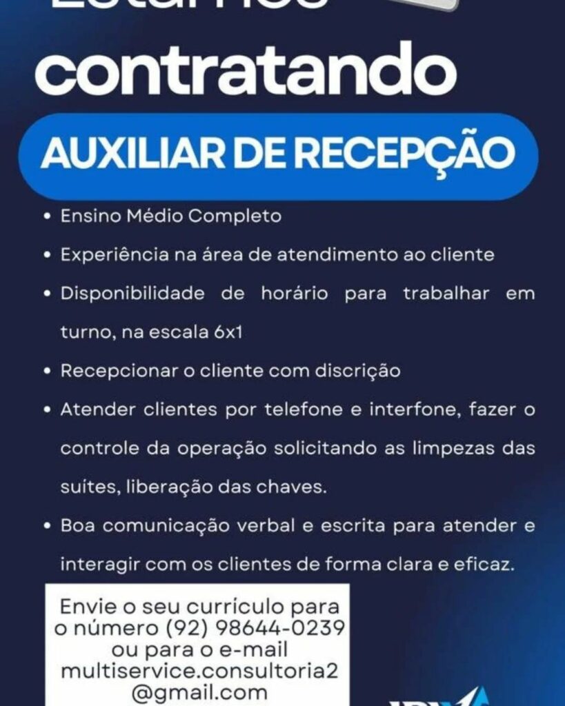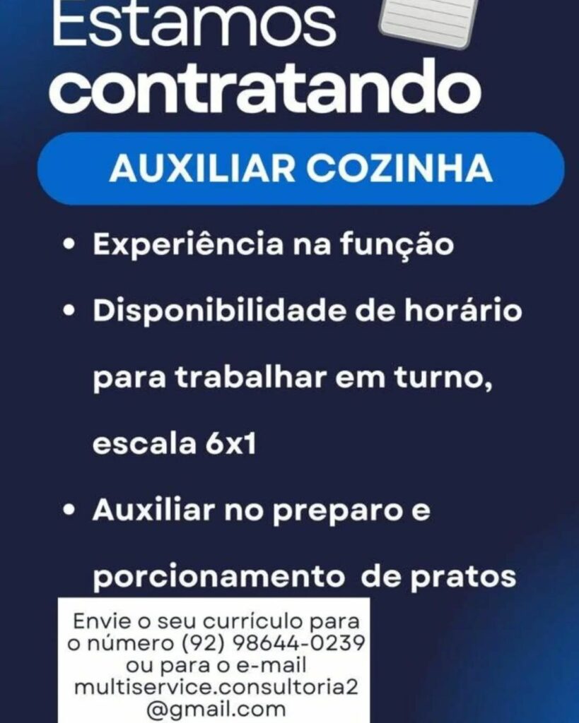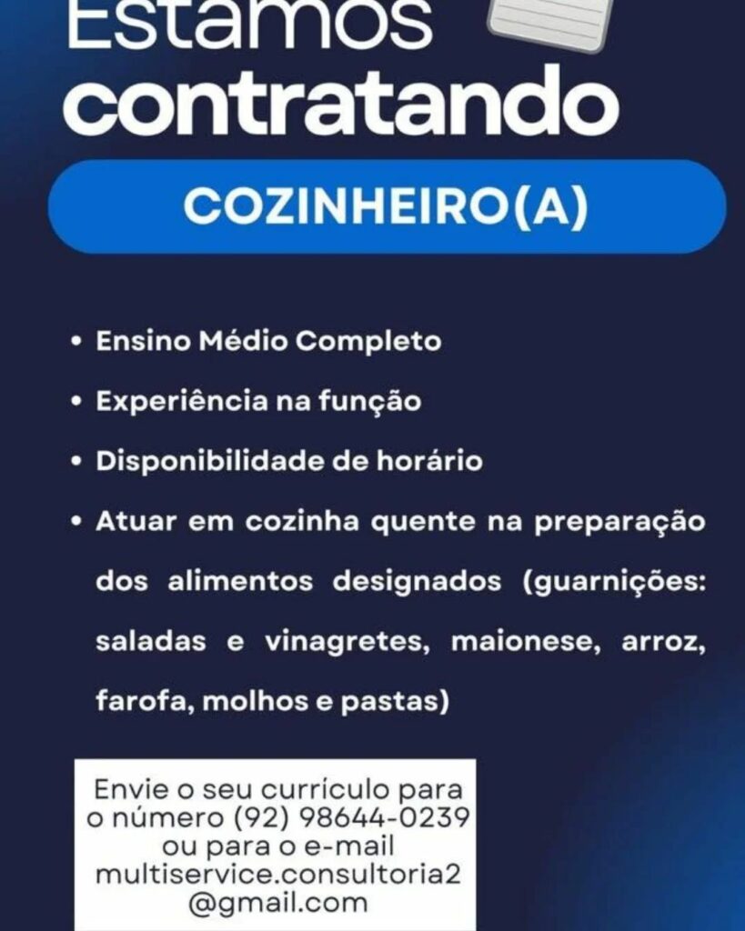 Seleção para seguintes vagas Auxiliar de cozinha, Cozinheiro (a), Auxiliar de recepção, Pizzaiolo; Envie seu currículo!