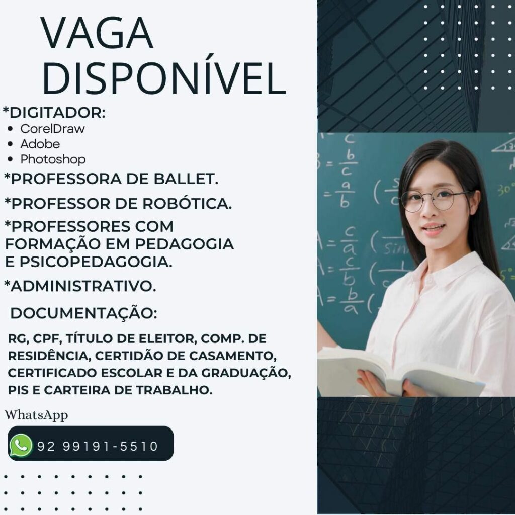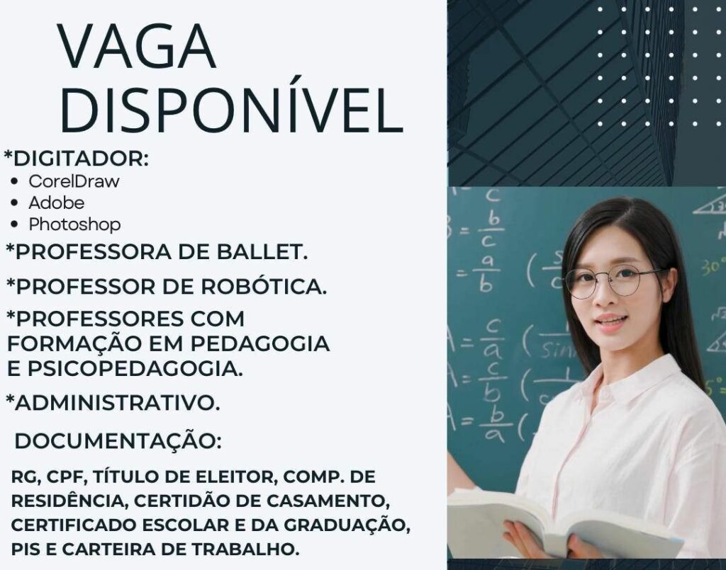 Seleção para seguintes vagas Digitador, Professora Ballet, Professor de robótica, Professores Pedagogia, Psicopedagogia, Administrativo; Envie seu currículo!