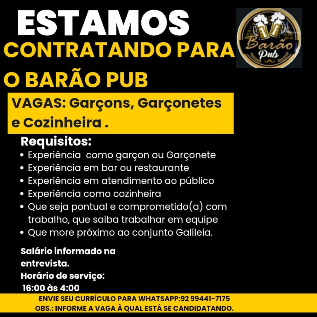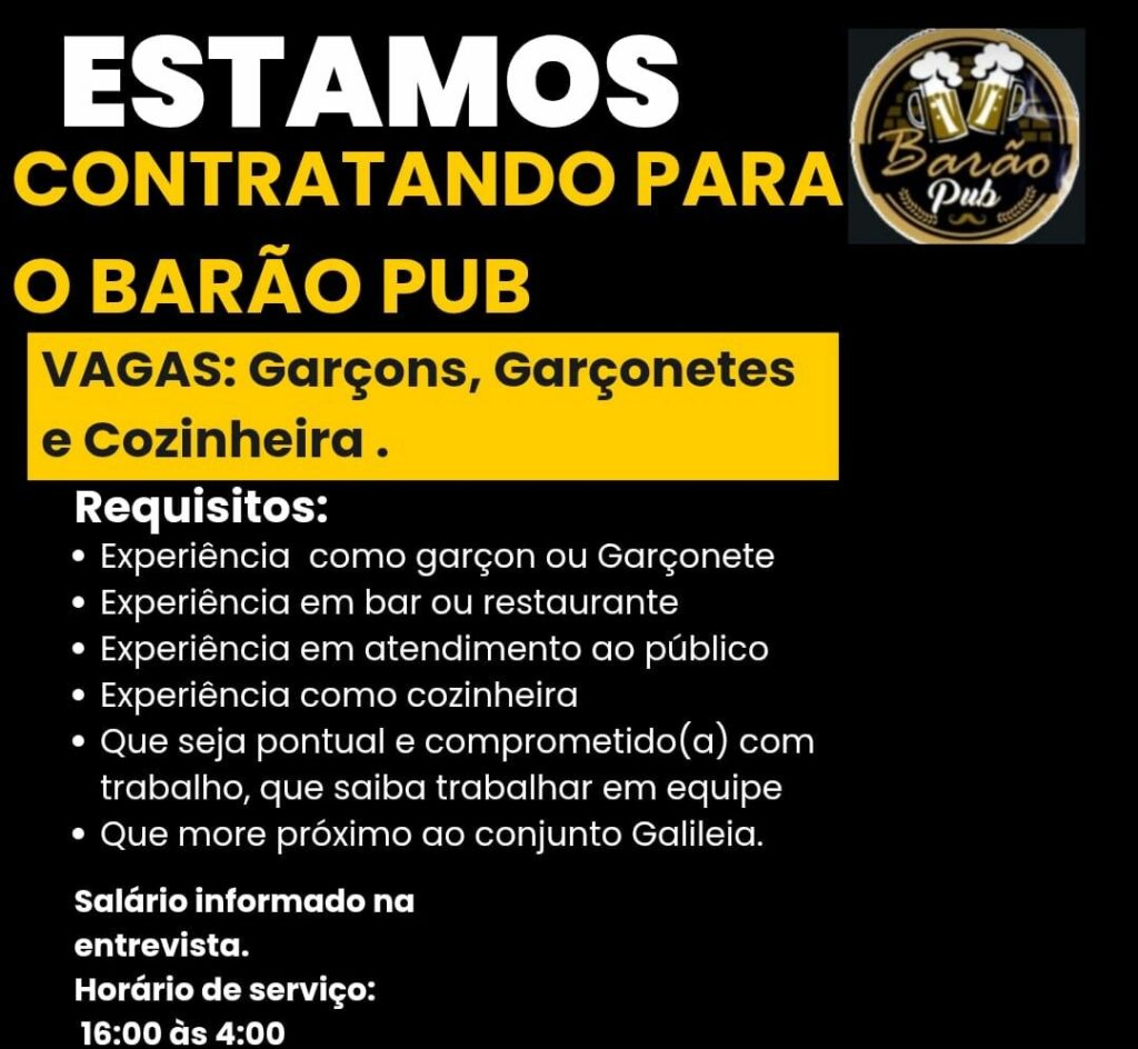 Seleção para seguintes vagas Garçons, Garçonetes, Cozinheira; Envie seu currículo!