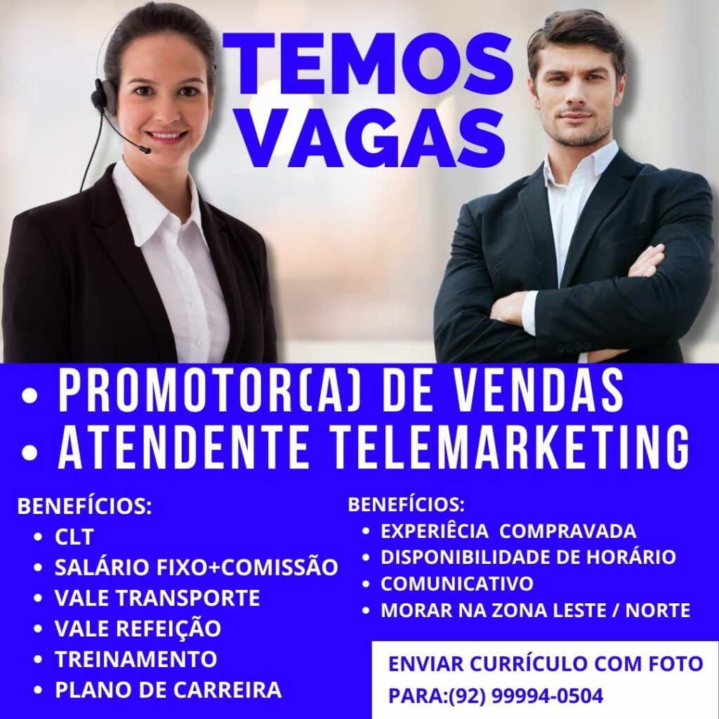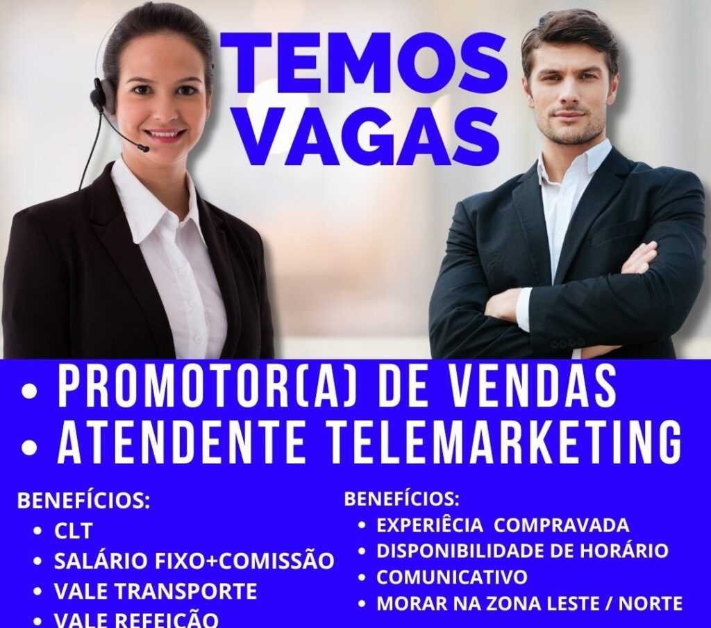 Seleção para seguintes vagas Promotor (a) de vendas, Atendente de telemarketing; Envie seu currículo!