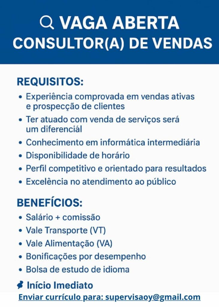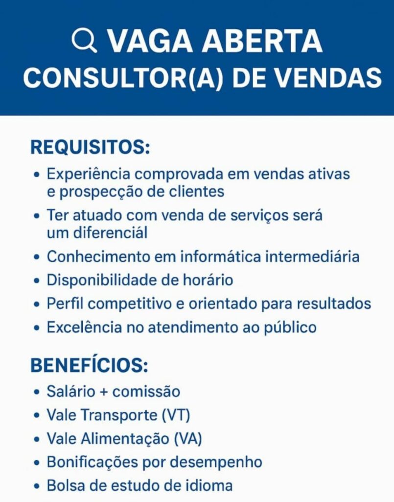 Seleção para vaga de Consultor (a) de vendas; Envie seu currículo!