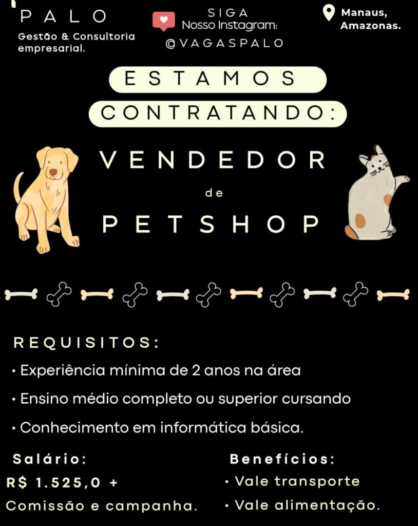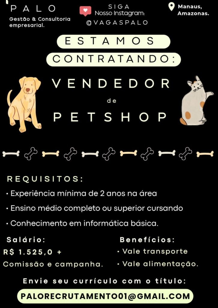 Seleção para vaga de Vendedor de pet Shop; Envie seu currículo!