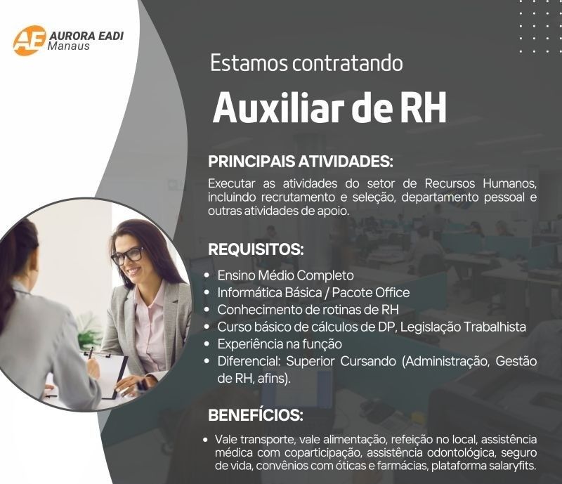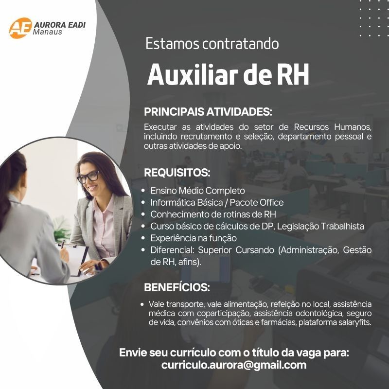 Aurora EAD está selecionando Auxiliar de rh; Envie seu currículo!