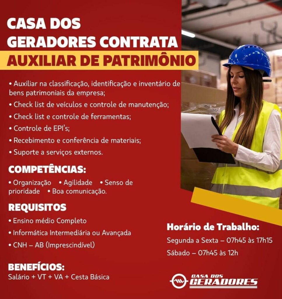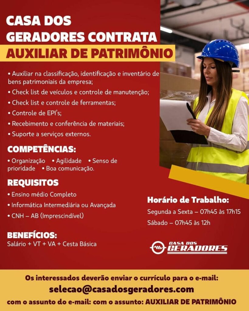 Casa dos geradores seleciona Auxiliar de patrimônio; Envie seu currículo!