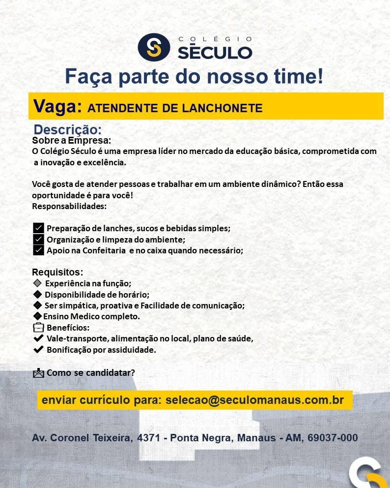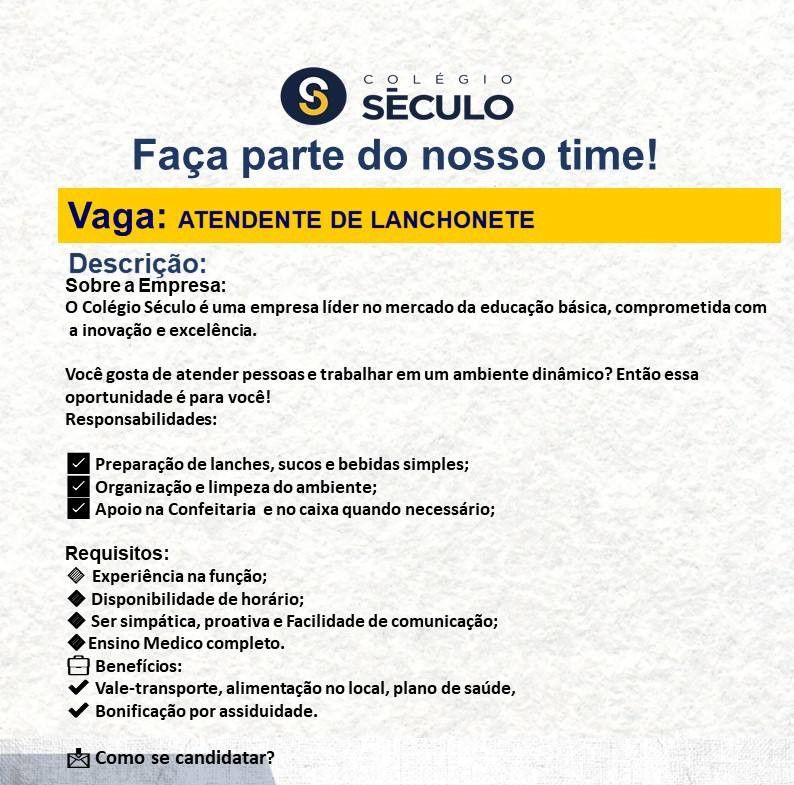 Colégio Século seleciona Atendente de lanchonete; Envie seu currículo!