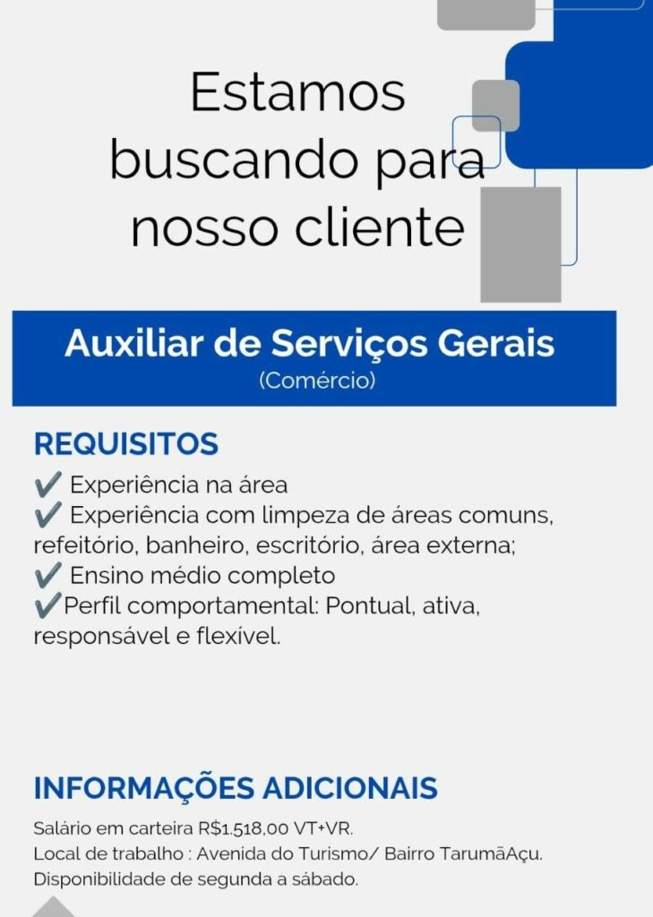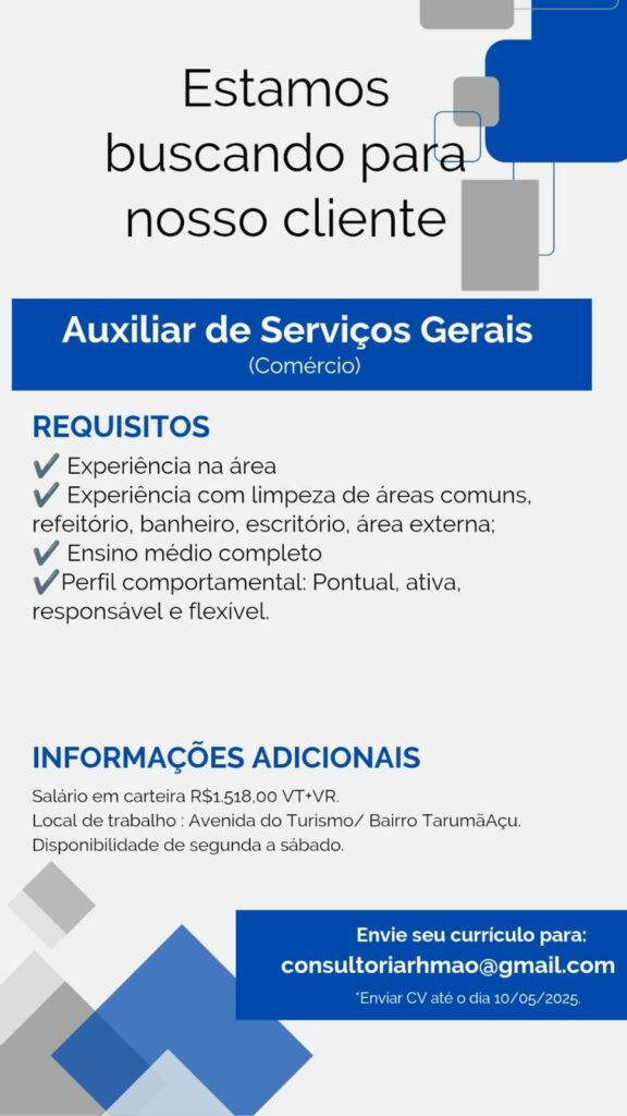 Comércio está selecionando Auxiliar de serviços gerais; Envie seu currículo!