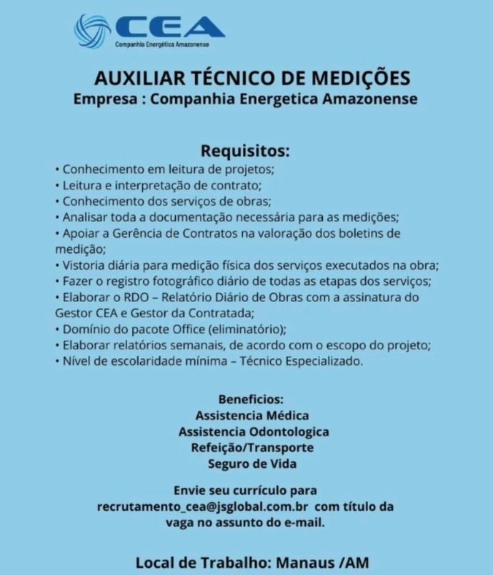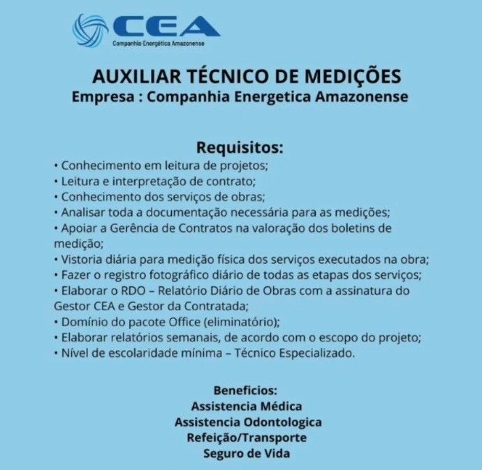 Companhia energetica amazonense seleciona Auxiliar técnico de medições; Envie seu currículo!