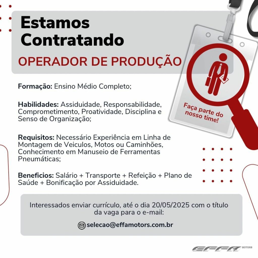 Effa Motors seleciona Operador de produção e mais 03 cargos; Envie seu currículo!