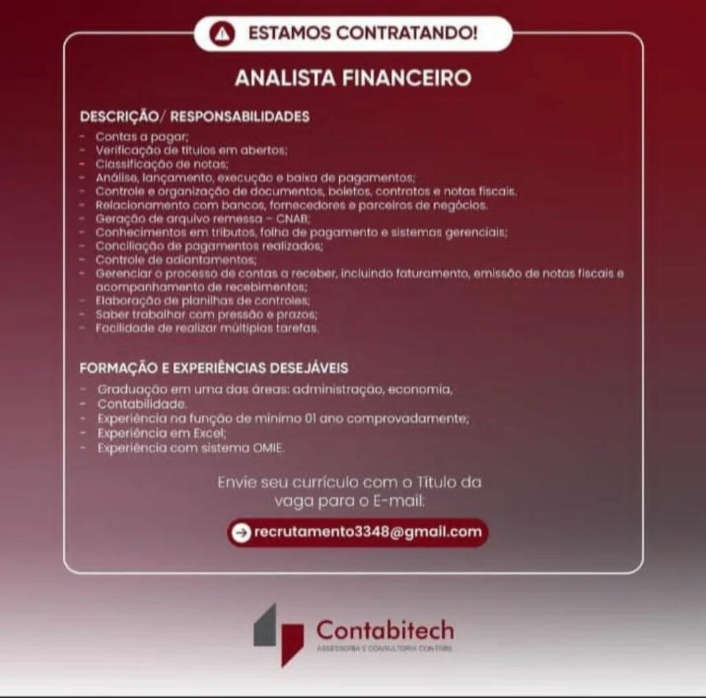 Empresa está selecionando Analista financeiro; Envie seu currículo!