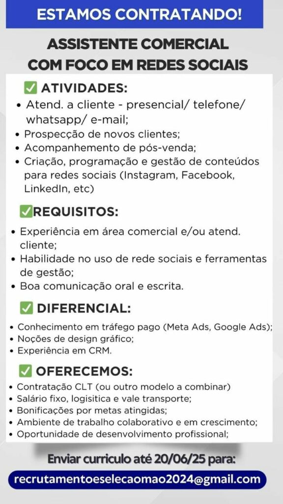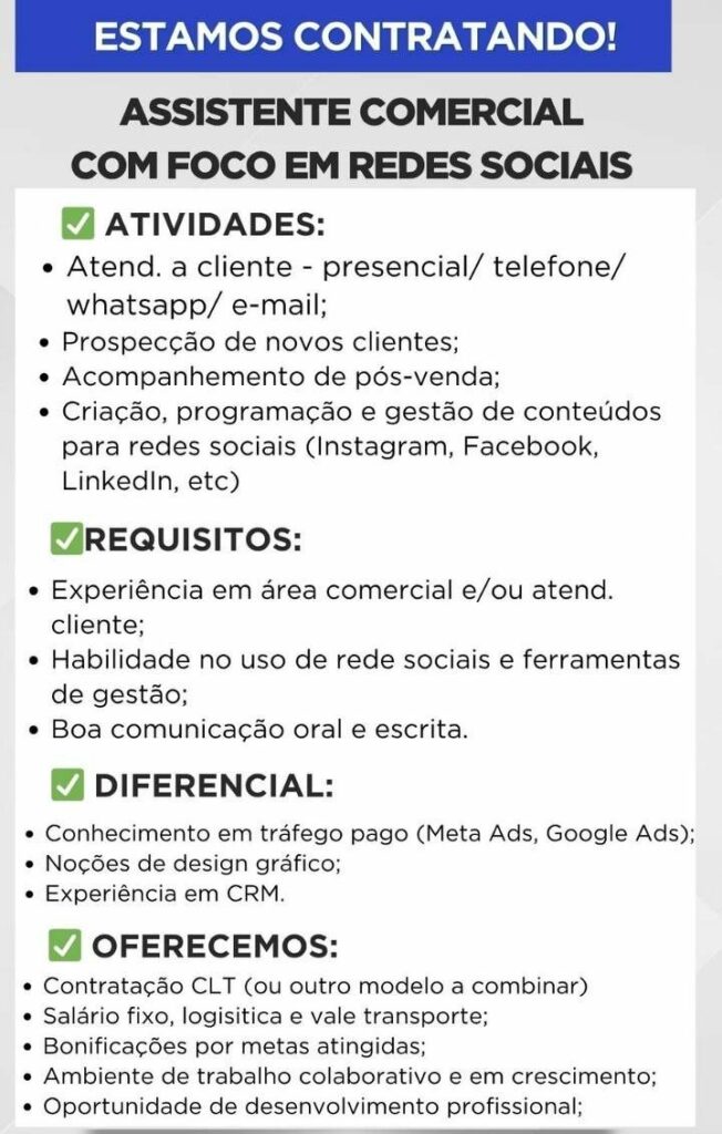 Empresa está selecionando Assistente comercial; Envie seu currículo!