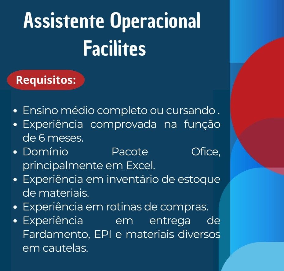 Empresa está selecionando Assistente operacional facilites; Envie seu currículo!